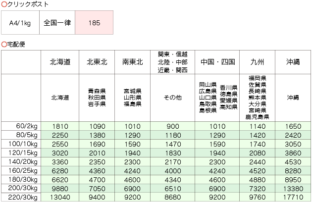 ※納品書など一部の表示で料金表から10%引いた送料に消費税10%をまとめて足した金額を記載する場合がございます。